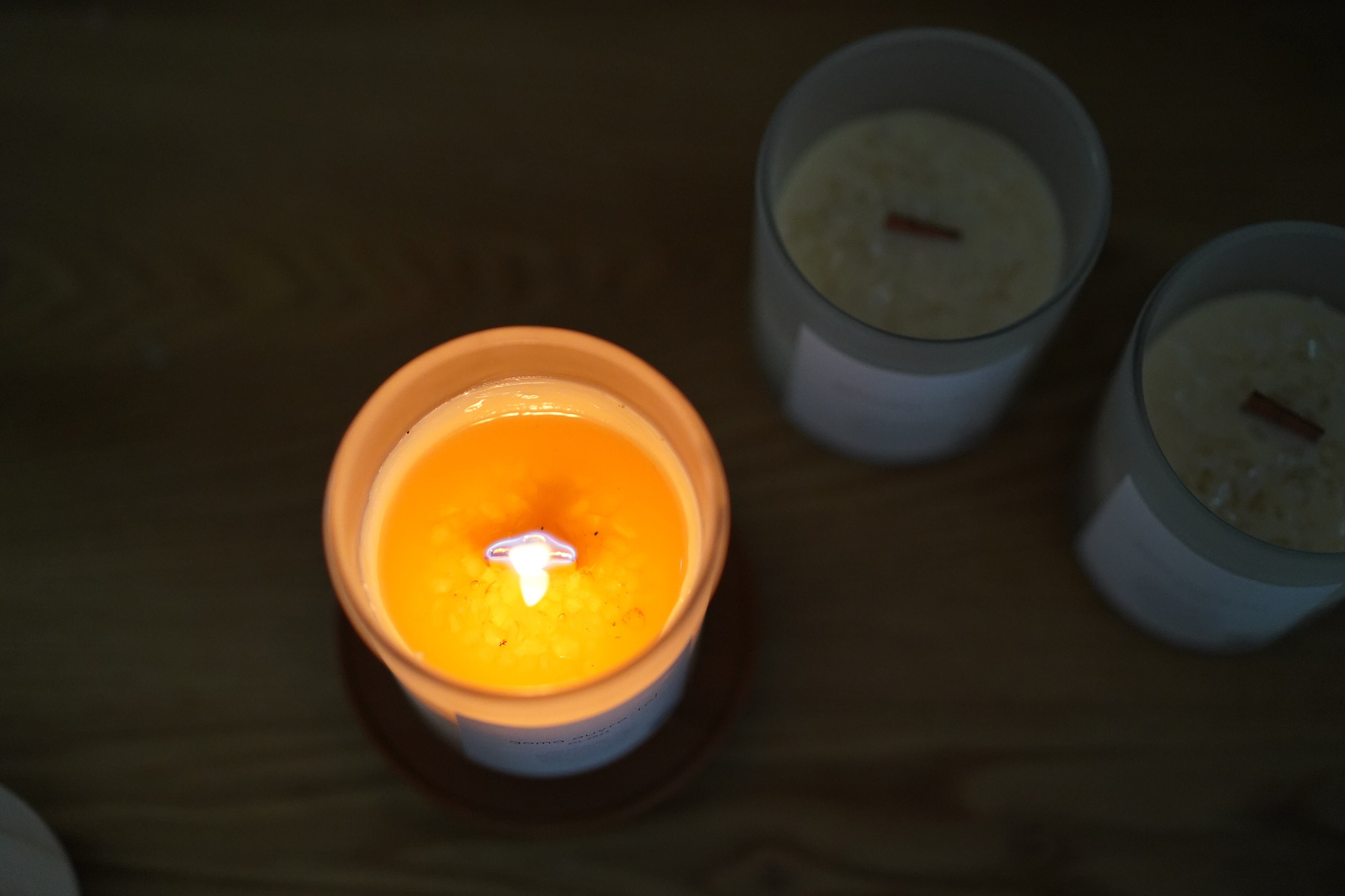 木芯を使用しています。ゆらゆらと炎がゆれ、パチパチと灯る音がします。精油がほのかに香ります。ゆったりとした静かな時間におすすめのキャンドルです。